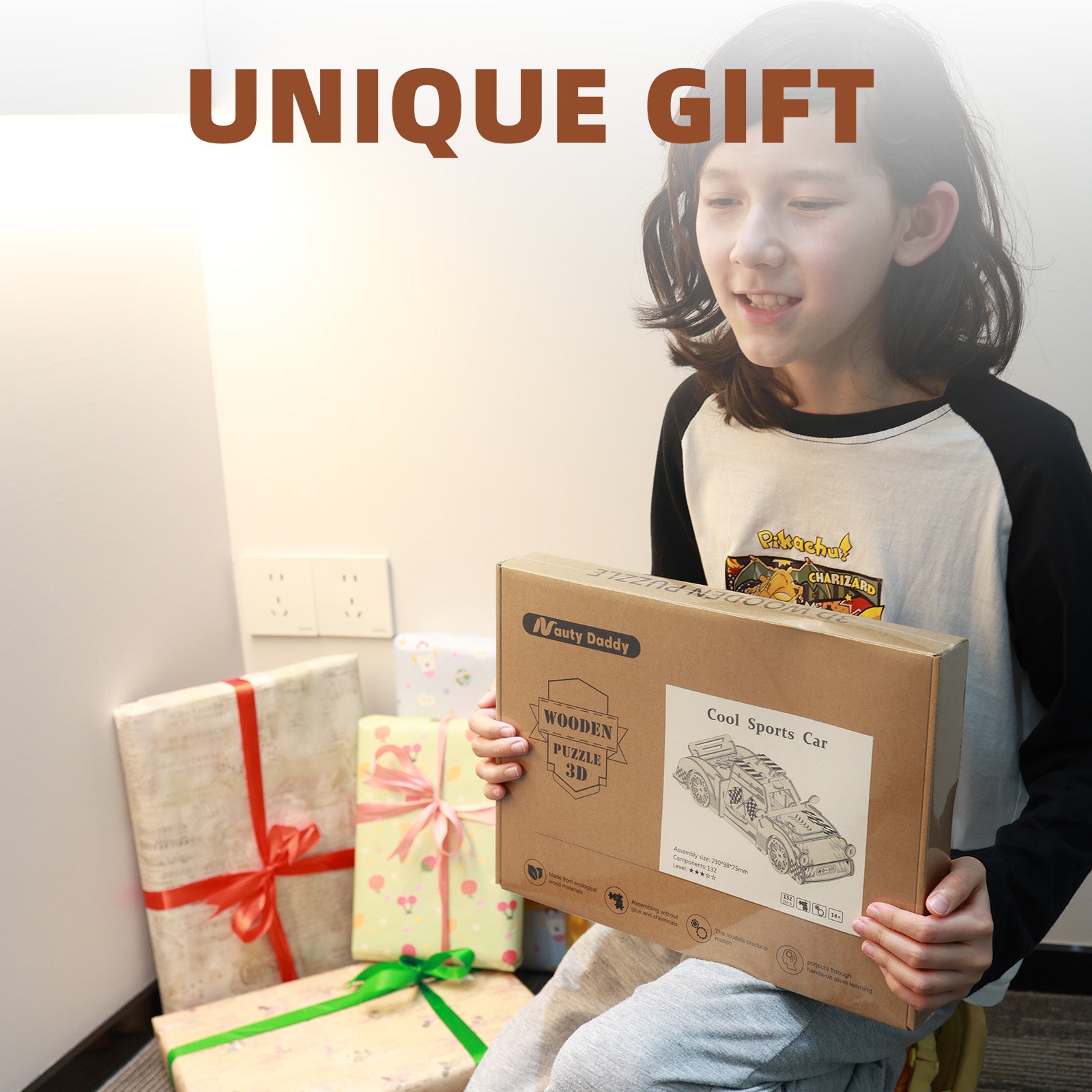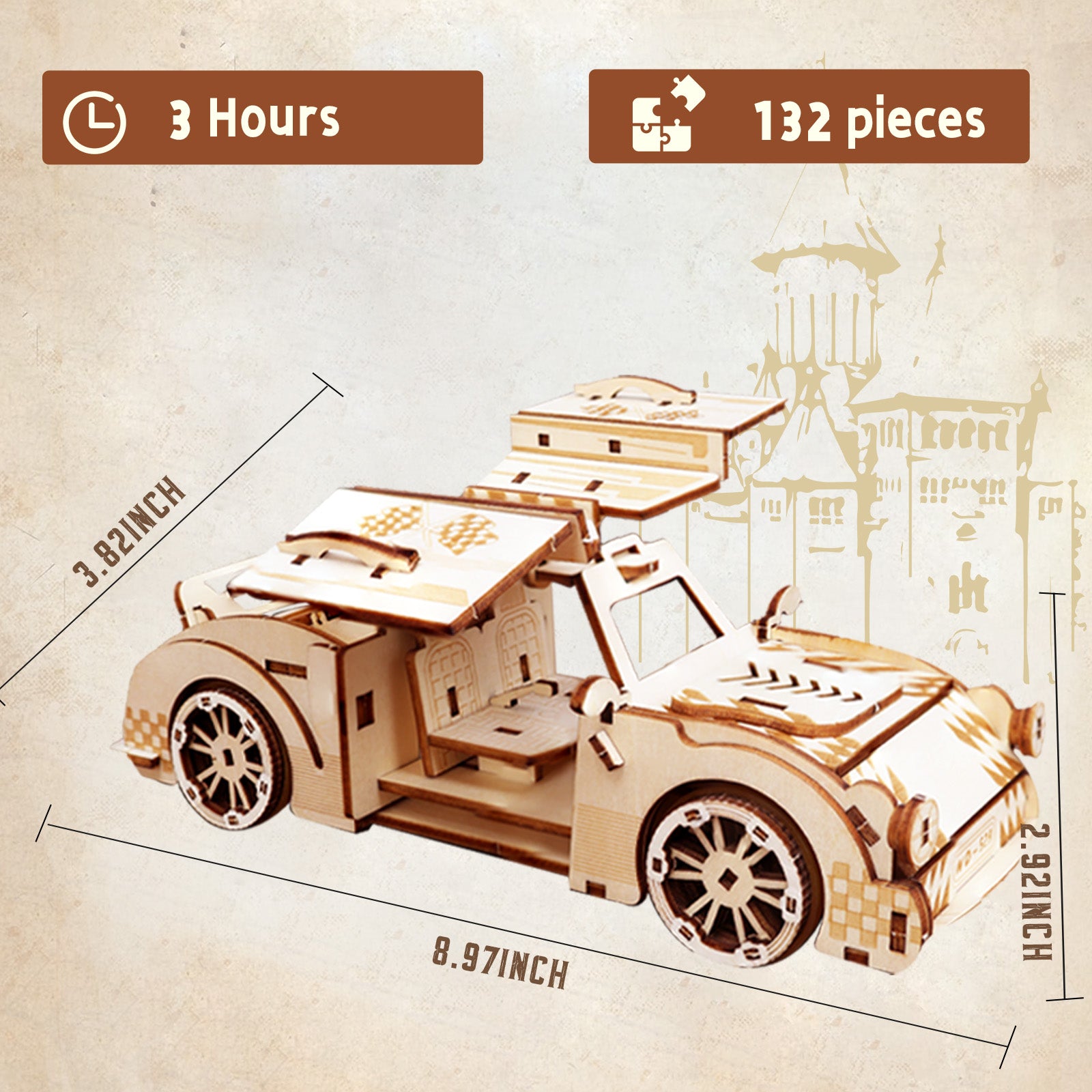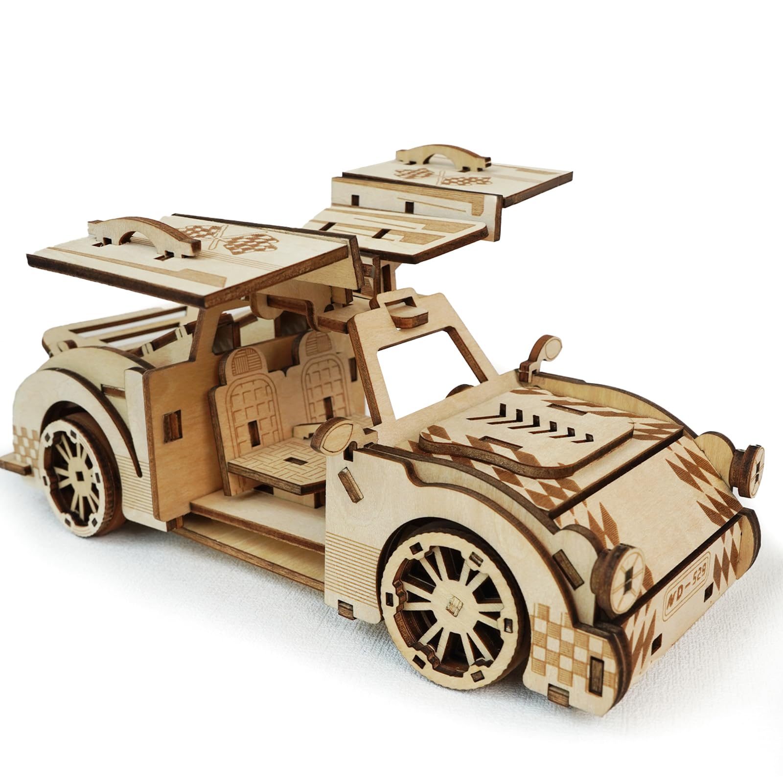 Hands-On Assembly: 3D wooden car model kit for kids to build and learn.